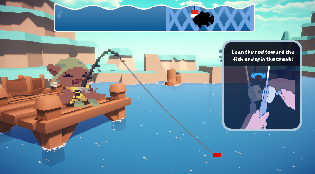 Fishing for Compliments is a fishing mini-game played with an unorthodox controller: a physical fishing rod! The controller detects movement along an axis, inviting players to mime real fishing motions, such as casting the line by swinging the rod forward. The reel of the rod is connected to a rotary encoder, allowing the player’s physical crank rotations to directly progress the game.